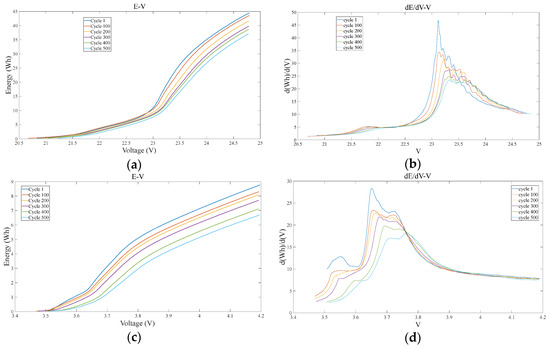 The E-V curve and IE curve of each battery under different cycles. (a) The E-V curves of the battery pack under different cycle times. (b) The IE curves of the battery pack under different cycle times. (c) The E-V curves of the battery cell (0.5 C) under different cycle times. (d) The IE curves of the battery cell (0.5 C) under different cycle times.