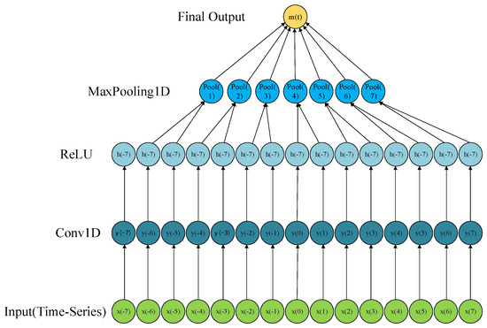 where is the output value of the convolution kernel at time step , is the value of the input time series, is the weight of the convolution kernel (size ), is the bias term, and is the convolution window size (i.e., the length of the convolution kernel).