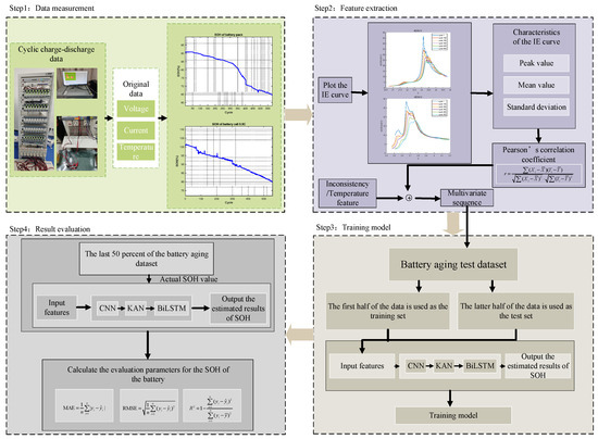 To overcome the above problems, this paper proposes the CNN-KAN-BiLSTM hybrid deep learning model. Among them, KAN is a deep learning method based on the Kolmogorov–Arnold approximation theorem. By utilizing B-Spline basis functions for feature transformation, KAN can effectively approximate complex nonlinear relationship. By integrating the advantages of convolutional feature extraction, nonlinear transformation enhancement and bidirectional time series modeling, the accuracy and robustness of SOH estimation are improved. This model first uses CNN to extract the local patterns of the input features, then adopts the Kolmogorov–Arnold Network (KAN) to replace the traditional fully connected layer to enhance the nonlinear mapping ability. Finally, the temporal evolution law of SOH is learned from both the positive and negative directions through the BiLSTM module to enhance the model’s ability to capture the degradation trend of batteries. Compared with the traditional hybrid structure, CNN-KAN-BiLSTM has achieved key improvements in multiple aspects. First, in terms of estimation accuracy, the KAN layer has adaptive activation ability, which can fit more complex nonlinear relationships and effectively improve the estimation accuracy. Second, in terms of computational complexity, the KAN module has a compact structure and is highly efficient in training without significantly increasing the computational burden of the overall model. Third, in terms of interpretability, the construction form of KAN makes the mapping process of intermediate features more physically readable, which is helpful for analyzing the specific influence of different features on SOH. Fourth, in terms of robustness, BiLSTM can capture temporal features from both forward and reverse directions, enhancing the model’s ability to adapt to inconsistent battery data and noise disturbances. Therefore, CNN-KAN-BiLSTM not only structurally optimizes the deficiencies of the existing models in terms of function expression, generalization ability, and interpretability, but also provides a more forward-looking solution for complex SOH modeling problems.