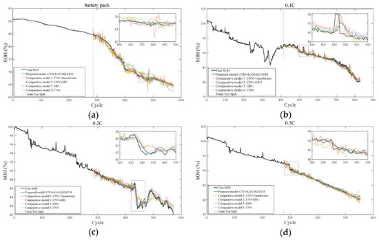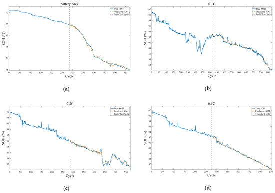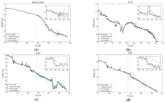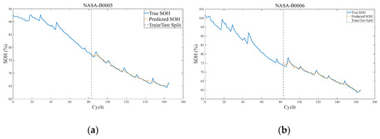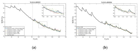 To verify the effectiveness of the proposed SOH estimation method, this paper selects the B0005 and B0006 lithium-ion battery datasets provided by NASA for experiments. This dataset contains real working condition data, complete charge and discharge cycle information, and rich sensor parameters. It is widely used in the research of battery health status assessment and life prediction, and can provide a reliable basis for model training and verification. The experimental results are shown in Figure 12a,b.