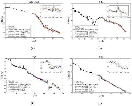 The comparative experimental results of some existing models. (a) Comparison of the experimental results of several existing models on battery pack. (b) Comparison of the experimental results of several existing models on the single cell battery (0.1 C). (c) Comparison of the experimental results of several existing models on the single cell battery (0.2 C). (d) Comparison of the experimental results of several existing models on the single cell battery (0.5 C).