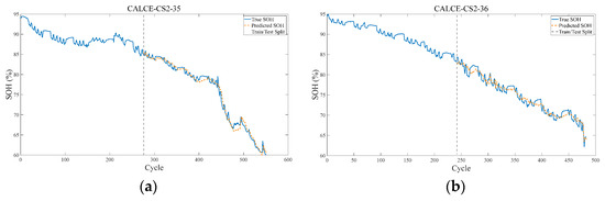 The training results of the CNN-KAN-BiLSTM model on the battery CS2-35 and CS2-36. (a) The training results of the CNN-KAN-BiLSTM model on the battery CS2-35. (b) The training results of the CNN-KAN-BiLSTM model on the battery CS2-36.
