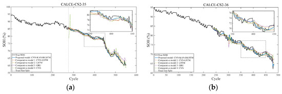 The experimental result graph based on the benchmark model was conducted using the CALCE battery dataset. (a) The experimental result graph based on the benchmark model on the battery CS2-35. (b) The experimental result graph based on the benchmark model on the battery CS2-36.