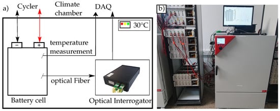 All experiments were performed in a climate chamber, as depicted in Figure 2a. A constant temperature of 30 °C was maintained to ensure stable conditions, thereby eliminating the impact of temperature fluctuations. The climate chamber employed is a Binder KB115 cooling incubator. In addition to the DUT, the measurement unit for the glass fiber was also conducted inside the climate chamber. For fiber optical measurements, a custom interrogator was employed. This interrogator uses an OceanOptics HR4000 spectrometer paired with a broadband light source that covers a range of 830–880 nm. It is capable of monitoring up to 16 fibers simultaneously using a FiberSwitch eol 1 × 16 optical switch by Leoni. The interrogator is controlled by using custom LabView software to allow precise adjustment of the limits and integration times of the optical signal.