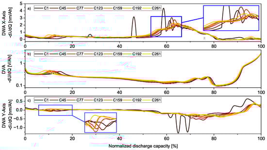 The strain in the X-direction (Figure 4a) shows a strong resemblance to the behavior observed in the DVA, particularly in terms of the shift at which the SOC feature occurs during discharge. For the X-direction of the optical sensors, a second distinct feature exists between 50% and 80% of the discharge capacity. Throughout the test protocol, this peak undergoes two significant changes: the overall width increases, accompanied by a steeper initial slope, and the global maxima of the peak shifts to the opposite side, starting later during discharge, with the exception of the last check-up. These changes in the curves of the DWA may be linked to LAMpe or LAMne due to the position of the feature during the discharge process. The second feature of the Y-DWA (Figure 4c) is less pronounced, occurring between 75% and 100% of discharge capacity. In the first part of this second feature, a flattening of the curve can be observed. However, at around 95% of the discharge capacity, a shift in the peak to the right can be observed. A possible reason for that may be changes in the cathode side due to the change occurring on the final stage of discharge. Therefore, a possible reason for these changes could be related to LAMne or LLI. For the anode side, only a small amount of graphite degradation can be observed []. Although some features between the DVA and DWA align (e.g., at 10% SOC), this is not true for the majority. In particular, the shift observed in the main peak of the X-axis data suggests that certain features are not associated with specific phase transitions identified in the DVA. Similar discrepancies have also been reported in external strain analyses using fiber-optic sensors to monitor mechanical deformation [].