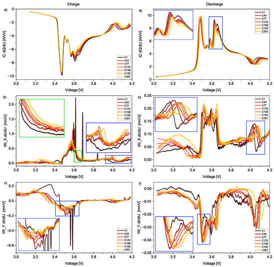When analyzing the ICA of the charge (Figure 5d) and discharge (Figure 5a), three characteristic features can be identified for both curves [,]. The ICA pattern does not indicate significant inhomogeneity. In both directions, the IWA data shown in Figure 3 exhibit changes that correspond to those observed in the ICA. This effect has also been reported in previous studies that included measurements of external strain []. Starting from the highest potential, the valley around 4.0 V corresponds to the second peak of the DVA [], most likely related to the filling of the cathode with lithium ions and changes in the negative electrode content from LiC6 to LiC12 []. Due to the different dependencies of the features on electrochemical changes, certain peaks can be attributed to different changes in the composition of the cell. The second feature, around 3.6 V according to the literature, depends on further lithium intercalation within the crystalline structure of the cathode. During this stage, graphite transformations from LiC12 to LiC18 are occurring []. The final peak around 3.4 V is mostly graphite, related to the remaining reactions of LiC18 to LiC24 and LiC36 []. Based on the shift in voltage and intensity of these features, both an LLI and LAMpe are suggested [,].