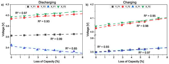 While the ICA captures the electrochemical changes across the cell potential, the location-dependent strain can be further elucidated using the IWA. Despite the integration of fiber into the anode active material, cathode processes also influence the strain experienced by the anode due to their interactions. To further understand and highlight the occurring changes in strain that can be observed by internal fiber optics, the voltage shifts of exemplary peaks have been illustrated in Figure 6, with F1 relating to a change around 3.6 V and F2 to a shift at around 4.1 V, respectively. The majority of discrete features demonstrate a strong linear correlation compared to the loss of capacity, with the coefficient of determination being higher than 95% for multiple points chosen. A relation between internal strain and cell degradation has been shown, which can be visualized by the IWA, enabling the method to be used for possible determination of the state of health, similar to the ICA [,,]. Most changes in the IWA resulted in a shift of the curve towards a higher voltage or a widening of the features, which results in a longer duration for the anode strain to rise or fall as the cell experiences aging. When analyzing these shifts compared with the changes in the ICA, a loss of lithium inventory is suggested. Furthermore, a rise in ohmic resistance might partially explain the changes observed [].