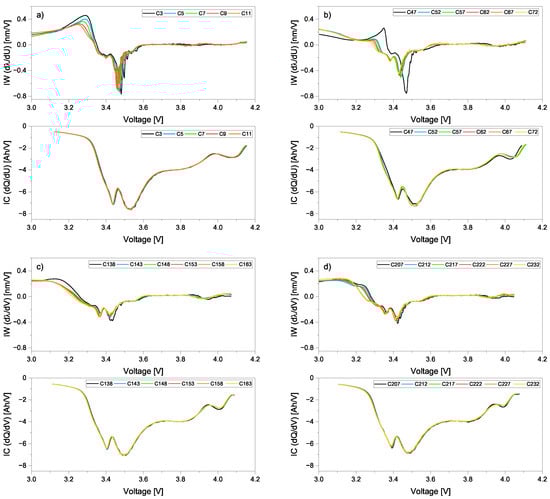 It seems that for later cycles, the properties of IWA converge with ICA (Figure 7c,d). Furthermore, Figure 7d shows only a slight difference from Figure 7c, and a change can be observed for the last two depicted cycles. This may be a first indicator of increased aging or a change in a chemical composition. Supporting this theory is the fact that the final check-ups of ICA (Figure 5) and DWA (Figure 4) show a pronounced deviation from the previous check-ups. Meanwhile, no anomalies can be seen in the ICA of Figure 7d. When comparing Figure 7a,d, it is observed that the valley around 3.5 V of the IWA shifts by a proportion comparable to the corresponding valley in the ICA. This change is assumed to be related to an increase in ohmic resistance. In addition, it appears that in later cycles, the properties of the IWA begin to converge with those of the ICA (Figure 7c,d). Subsequently, a valley around 4.0 V is starting to form for the IWA, similar to the ICA. For the later cycle under load in Figure 7d, only slight differences from Figure 7c can be observed. However, a noticeable change in the last two cycles is shown, which may be an early indicator of increased aging or changes in chemical composition. In support of this theory, the final check-ups in the ICA (Figure 5) and DWA (Figure 4) show pronounced deviations from previous check-ups, highlighting significant changes. Meanwhile, no anomalies are observed in the ICA of Figure 7d, suggesting that IWA, which is directly related to internal strain, may capture subtle aging effects that are not as apparent in ICA.