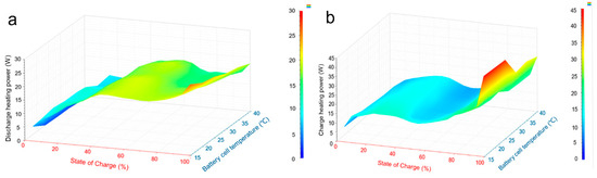 According to the IBC test, the stepped heating power data within the normal temperature control range of 15~40 °C of the cell were obtained, and the relevant models were established, as shown in Figure 1. According to the test of charging and discharging heating power of LIB under different temperature and SOC states, it was found that the battery’s thermal behavior showed significant dependence on both temperature and charge state. Under charging conditions, the heating power increased with the increase in SOC, the heating power at the charging end and the discharge end increased significantly, and the heating effect was aggravated by the low temperature environment. In the actual use process, temperature control and working condition should be adjusted according to the characteristics of the heating power of the cell, which provide key data support for the design of BTMS.
