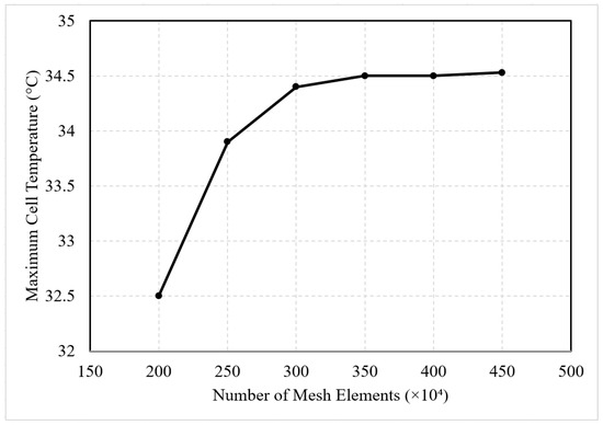 For the battery module meshing, hexahedral elements were applied using the ANSYS FLUENT meshing module. Compared to tetrahedral meshes, hexahedral meshes offer higher accuracy with fewer elements. Additionally, localized hexahedral mesh refinement was implemented in critical areas such as the fan, outer surfaces of individual cells, and inner surfaces of the battery enclosure to ensure computational precision. As shown in Figure 2, a mesh independence study was performed to verify the numerical accuracy, evaluating six mesh configurations ranging from 2.0 to 4.5 million elements. The maximum battery temperature stabilized beyond 3.5 million elements. Therefore, a mesh size of 3.5 million elements was selected to balance computational accuracy and efficiency.