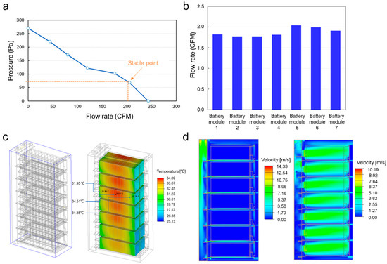 The operation characteristic of the fan was analyzed. As shown in Figure 3a, the fan maintained a stable operating point at 202 CFM (0.095 m3/s) with 70 Pa static pressure, while the system exhibited low flow resistance characteristics, which could better actualize the heat dissipation performance of the fan. In Figure 3b, we see that each cartridge achieved consistent cold airflow rates, averaging 1.88 m3/min (±7% variation), demonstrating excellent flow distribution uniformity across the system. The simulation analysis result of the battery cabinet is shown in Figure 3c. The cooling airflow was drawn into the cabinet by the fan and uniformly distributed to all cartridges through the guided deflection system. The temperature distribution across modules exhibited good uniformity, with spatial variations limited to 3 °C at comparable locations. The peak temperature within the battery cluster was 34.9 °C, which meets the thermal management requirements and reflects the consistency of the temperature field. The cooling design of the battery cabinet adopted the dual-path cooling mode at the bottom and side of the module. Figure 3d illustrates the flow field distribution across both the module cross-section and the inter-module gaps. The module cross-sectional flow profile demonstrated bottom cooling efficiency, while the gap section flow characteristics enabled a sidewall convective heat transfer performance.