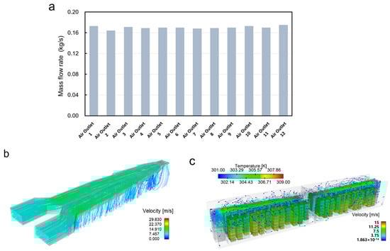 Fluent software was employed to perform CFD simulations of the air conditioning main duct design, with results validating the configuration’s engineering feasibility. Among them, the air volume of a single air duct was 5000 m3/h, and the simulation physical model was an SST-kw turbulence model. The simulated mass flow rate distribution across duct outlets is presented in Figure 4a. As could be seen from the simulation results, the minimum flow rate of each outlet in the air duct design scheme was 0.164 kg/s, the maximum flow rate was 0.175 kg/s, and the deviation between the maximum and minimum air volumes was 6.7%. The air duct design scheme met the thermal management design requirements, and the air duct flow line is shown in Figure 4b. The Fluent software was used to conduct CFD simulation analysis on the whole container. Four air conditioners were used for the cooling of the container. The air volume of each air conditioner was 5500 m3/h and the cooling capacity was 20 kW. Figure 4c presents the instantaneous cloud distribution at the conclusion of the transient simulation. Under the diversion of the top air duct, the flow distribution of each outlet of the air duct was relatively uniform, which could provide a uniform cooling capacity for each battery cabinet. The container temperature distribution was uniform. The thermal analysis yielded a peak temperature of 36.2 °C with a maximum differential of 3.6 °C across the system.