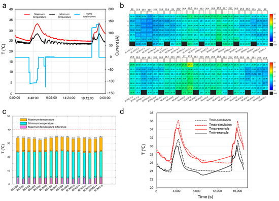 The maximum and minimum temperature and current change curve of the cell during charge and discharge (a), distribution diagram of the average temperature of each module in the container (b), image of maximum, minimum and maximum temperature difference of each battery cluster in the container and (c) temperature comparison curve between simulation results and measured data (d).