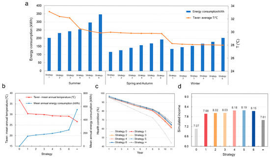 We assume that the SOH corresponding to the system EOL is 70%. The benefit of the station is the integration of the comprehensive energy efficiency with system life, and a comparison of simulation returns under different strategies could be obtained (Figure 6d). Specifically, with the enhancement of temperature control capability, the simulation benefit of the system gradually increased, and it reached its highest value around strategy 5. After that, the total benefit decreased. There are two main reasons for the above optimization results, as follows: (1) The relationship between battery life and temperature is negative, as the more the temperature increases, the faster the battery life decreases. (2) The relationship between power consumption and average operating temperature is positive, as the more the temperature decreases, the more power consumption increases.