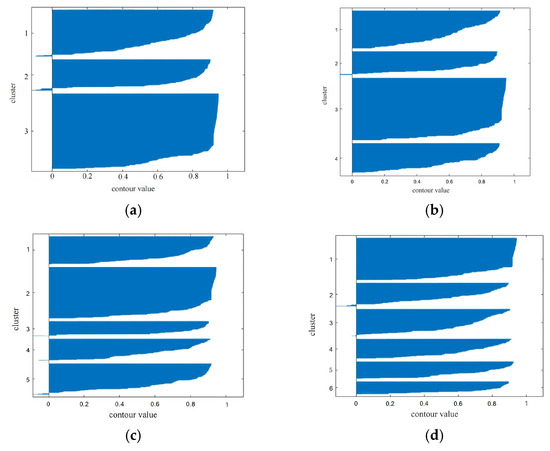 Distribution of contour coefficients for four different k-value cases. (a) Distribution of contour coefficients for a k value of 3. (b) Distribution of contour coefficients for a k value of 4. (c) Distribution of contour coefficients for a k value of 5. (d) Distribution of contour coefficients for k value of 6.