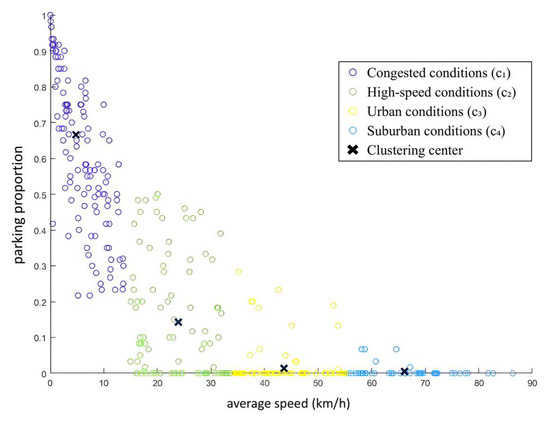 Figure 4 illustrates the clustering results with average speed and parking percentage, which are finally classified into four categories of working conditions: