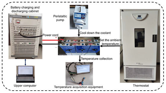 To validate the practical effectiveness of the predicted working conditions, we established a laboratory platform and employed a tailored battery pack to simulate the behavior of the vehicle’s entire battery system, as shown in Figure 10. The bench mainly includes a charge/discharge meter, thermostat box, host computer, temperature tester, etc. The battery charge/discharge meter (equipment model: CT-4008-5V100A-NTA, NEWARE, Shenzheng, China) supports an 8-channel independent charge/discharge experiment. The charging voltage range of the device is 0~5 V, the discharge voltage range is 2.5~5 V, the range of both charging and discharging current is 0.5~100 A, and the accuracy is ±0.1% of FS, and the working environment temperature is 0~40 °C. Thermostat box (device model: BPC-70F~250F), the temperature measurement range of the device is −5~70 °C, the temperature fluctuation at high temperature is ± 0.3 °C, the temperature fluctuation at low temperature is ±0.5 °C, and the temperature uniformity in the thermostat box is ±1.5 °C. The temperature tester (device model: Raspberry Pi 3B+), which can record the temperature data of three test points at the same time, and has a data storage function because it is a computer by nature.