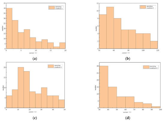 Working condition III represents the urban road driving conditions. The speed is relatively low, and the parking frequency is relatively high. The battery current is smaller compared to working condition IV. Working condition IV represents the suburban driving conditions. The speed is relatively higher than that in working condition III, so the current is also relatively higher. As can be seen from the Figure 12, under working condition IV, the number of battery currents between 30 A and 40 A is close to half. This is because the vehicle has a steady driving speed, and the battery current remains stable. However, its maximum current can reach 100 A. This is because, in suburban driving conditions, there are situations of sudden acceleration. At this time, the motor requires a larger current for driving, resulting in a sharp increase in the battery current.