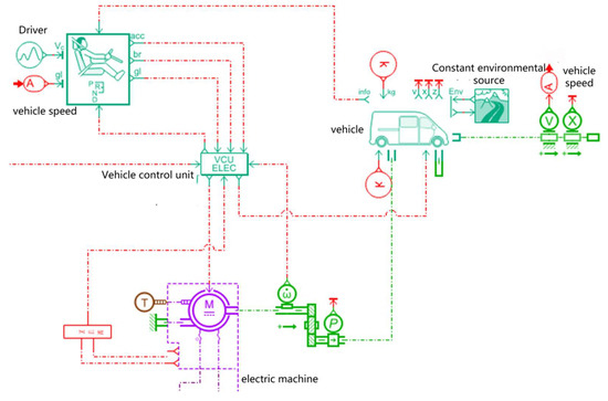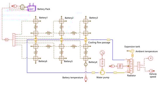 We established a liquid cooling system model (Figure 14) and a whole vehicle model (Figure 15) in AMESim. The implicit integration solver is adopted, and the time step is 0.01 s. The specific parameters are as follows.