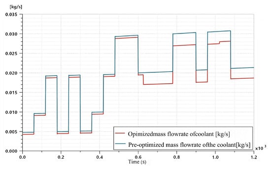 The mass flow rate of coolant before and after optimization with time under predicted operating conditions.