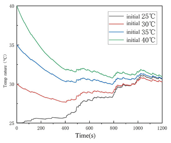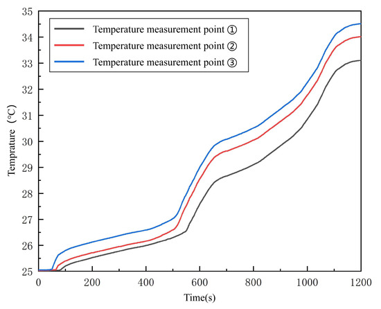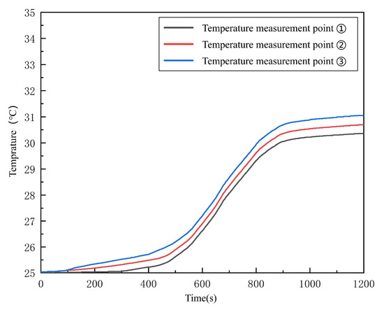 Figure 18 shows the temperature rise at the center of the surface of the battery pack under the actual vehicle driving conditions (without predicted working conditions). As can be seen from Figure 18, the temperature at temperature measurement point ③ was the highest, reaching 34.5 °C eventually. This was because the temperature measurement point ③ was located the farthest from the water inlet. The coolant exchanges heat with the heat generated by the battery inside the cold plate. Therefore, the closer it was to the water outlet, the higher the temperature of the coolant. The final temperature at temperature-measuring point ① was 33.1 °C, which was 1.4 °C lower than that at temperature-measurement point ③. This is because the battery where temperature measurement point ① was located is the closest to the water inlet, and the coolant exchanges heat with this battery first. Figure 19 shows the temperature rise at the center of the surface of the battery pack after the implementation of the thermal management strategy for cooling under the predicted working conditions. As can be seen from Figure 19 the measured temperatures increased successively from temperature measurement point ① to temperature measurement point ③. Among them, the temperature at temperature measurement point ③ was the highest, reaching 31.1 °C, while the temperature at temperature measurement ① was the lowest, being 30.4 °C.