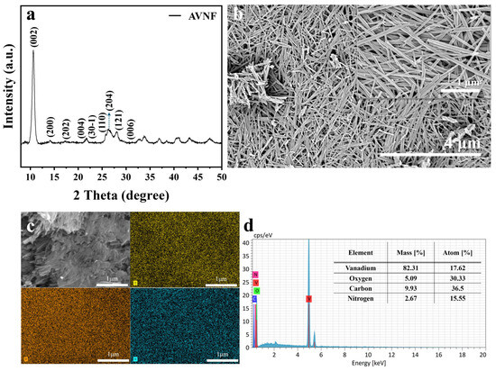 30]. Also, EDS analysis shows a homogeneous distribution of elements including vanadium, oxygen, and nitrogen throughout the structure, as shown in