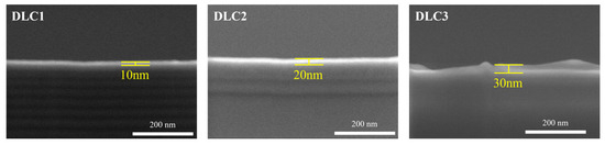q = 3.66 nm), indicating an effective reduction in nanoscale protrusions. However, further increases in DLC thickness led to a gradual rise in roughness, possibly due to increased internal stress or nanoscale agglomeration during film deposition. Roughness parameters (R