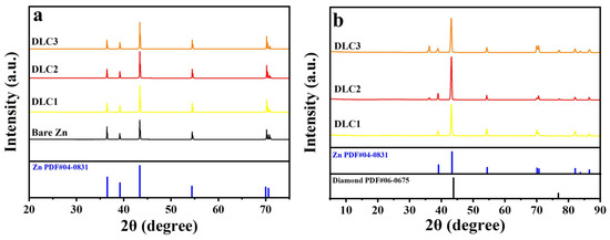 Figure 2, the thickness of the DLC1, DLC2, and DLC3 is approximately 10, 20, and 30 nm, respectively. To investigate the structure of the DLC on the zinc anode, materials analyses using XRD and GIXRD were performed. XRD patterns of bare zinc and DLC-coated zinc anodes are shown in