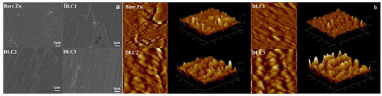 Figure 4a, the SEM images reveal that the surface of the bare zinc anode exhibits smooth and uniform morphology. Following the deposition of DLC coatings, the overall surface morphology of the DLC-coated samples appears similar to that of bare zinc, indicating that the DLC films covered the zinc anode without introducing significant surface irregularities. As shown in
