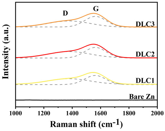 Figure 5. No significant peaks were observed in the bare zinc anode in the Raman spectra, indicating the absence of carbon-based materials on its surface. In contrast, DLC-coated zinc samples exhibited two prominent peaks, the D-band (~1350 cm