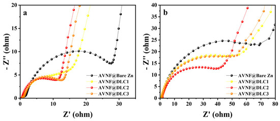 Figure 6. Also, EIS was conducted to evaluate the interfacial resistance of bare zinc and DLC-coated zinc anodes. The Nyquist plots of the samples are clearly presented in