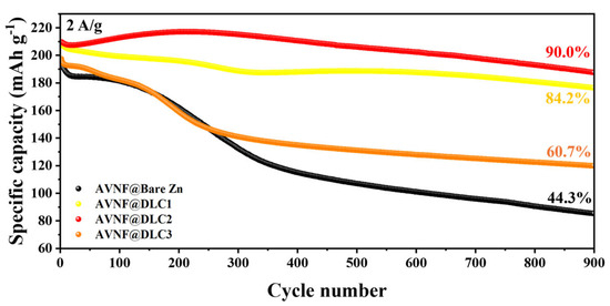 The cycling performance of the aqueous zinc battery was significantly influenced by the thickness of the DLC coating on the zinc anode. As shown in