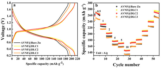 Figure 7. The gravimetric charge–discharge and rate capability of the full cell with DLC-coated Zn anode and AVNF are also documented in