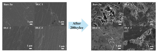 Figure 4 shows the surface morphology of the bare Zn and DLC-coated Zn electrodes. As shown in