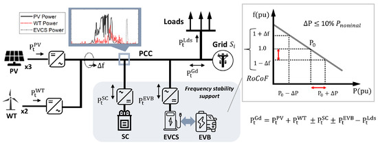 In summary, this system represents the integration of RESs and ESSs, which combine to ensure stability in the frequency and power supplied to the power grid. It also improves the resilience of the modern electrical system thanks to the functionality of EVBs. Consequently, the V2G configuration provides backup power to mitigate frequency variations in the power grid, offsetting the loss of inertia of the distributed system caused by the high penetration of renewable sources.