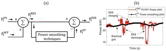 Figure 2a illustrates the operation of power smoothing techniques in renewable energy generation systems. The traditional block diagram describes the power flow from photovoltaic power and wind power , whose combination represents the total renewable power . Subsequently, is processed using power smoothing techniques ; the reference smooth power provided to the storage system is subtracted from the original signal to obtain . This interpretation is shown in Equation (3).