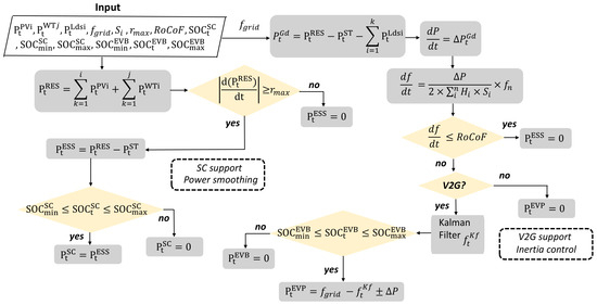 The following Figure 3 summarizes the flow of the power–frequency control process based on power smoothing and frequency stability with SC and V2G systems, respectively.