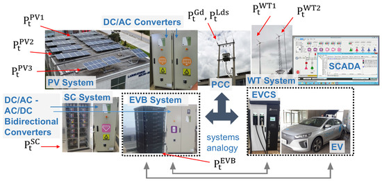 The structure of an MG includes an integrated renewable-energy generation, storage, and distribution system. Figure 1 shows a renewable generation system consisting of a photovoltaic system and wind turbines , which are represented as RESs. Another important component is the supercapacitor, represented as a storage medium to mitigate power fluctuations in the grid, and labeled . It also includes an EVCS, illustrated as a charging station. This also has storage functions and utilizes bidirectional energy from the EVB, represented as .