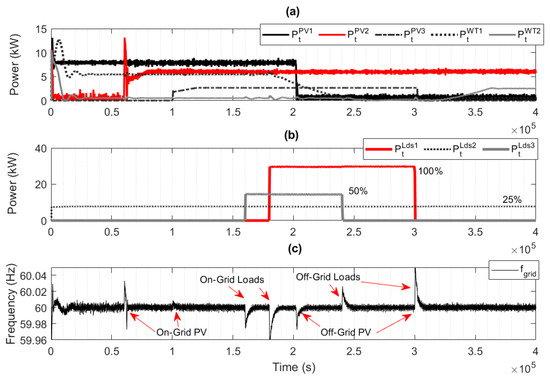 Frequency stability is crucial for the safe and efficient operation of the grid, and deviations can lead to problems such as overloads, unplanned disconnections, and damage to electrical equipment. Mitigating these effects fundamentally requires the implementation of energy management and storage strategies that balance supply and demand, i.e., load management systems. In this context, Figure 5 presents the dynamic behavior of a grid-connected generator in the case study configuration, where the balance of generation, consumption, and frequency stability in a PCC is analyzed. The first graph details the power generated by several RESs, three different photovoltaic systems, and two small-capacity wind turbines, reflecting their contribution in kilowatts (kW) over time. Figure 5b represents the energy consumption of different loads and demand percentages in kW to analyze their impact on frequency stability. Finally, the grid frequency stability is presented, expressed on a 60 Hz grid, indicating critical events such as the connection or disconnection of grid-tied generator elements (See Figure 5c). This representative form of the grid-connected generator allows analysis of the interaction between its different components in terms of generation, consumption, and frequency, allowing for evaluation of the operational stability of the electrical system in the face of common disturbances.