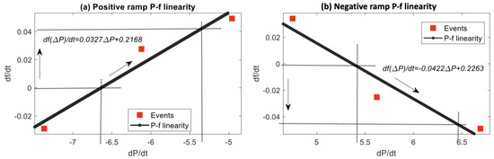 The negative slope (−0.0422 Hz/kW) means that an increase in power tends to cause a drop in , which determines a response with a linear approximation. Consequently, the adjustment of to can be estimated according to the following equations for negative and positive rates of change, respectively.