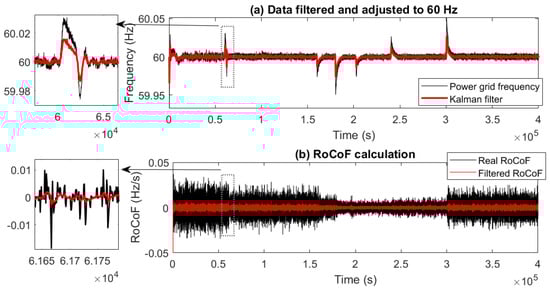 The integration of a Kalman filter allows for the execution of a predictive correction and adjustment vector toward the nominal frequency of 60 Hz, which improves the system’s input-frequency signal. The adjustment coefficients and allow for operation within an optimal range and act only in case of power fluctuations, thus limiting the RoCoF.