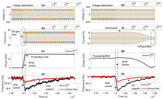 On the other hand, Figure 9e–h show how the system behaves in the face of an RES disturbance. In (e) and (f), the voltage and current have more controlled variation, but the presence of a momentary disturbance stands out. The power generated by the renewable source (g) shows a gradual decrease, indicating the inherent variability in this type of energy. Finally, the frequency (h) shows a similar behavior to that in graph (d), with an initial drop mitigated by SC support and a Kalman filter. Overall, the graph shows the importance of and control strategies for maintaining the stability of the electrical system.