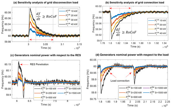 Sensitivity analysis: (a) grid load disconnection, (b) grid load connection, (c) impact of RES on nominal power of system, and (d) impact of load on nominal power of system.