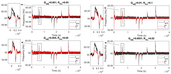 As can be seen, the Kalman filter responds to different tuning parameter settings. A setting of and represents very limited tuning and requires a large operational capacity. However, a setting of and allows operation only in the event of power fluctuations, which guarantees the optimization of the process and limits the RoCoF.
