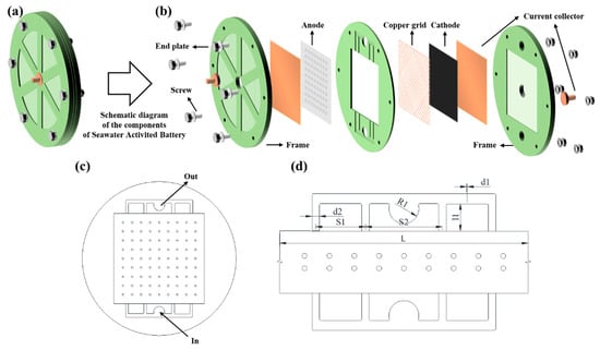Structural diagram of the aqueous AgO-Al battery. (a) Fully assembled battery unit. (b) Exploded view of the internal components of (a), including end plates, anode, copper grid, cathode, and frame. (c) Flow channel plan diagram. (d) Flow path diagram.
