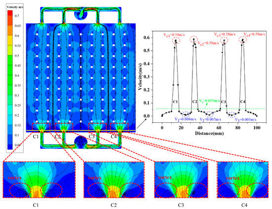 Figure 3 shows the velocity cloud and vector diagram, which are based on the given flow channel structure. In the whole flow -field area, the velocity distribution in the middle of the reaction zone was relatively uniform, and large velocity gradients were mainly observed on the inlet and outlet sides, especially near the secondary branch channel. Further, the velocity vector in the reaction zone was mainly the direction from the inlet to the outlet, but there were different degrees of eddy currents on both sides of the inlet channel. This is because when the fluid flowed from a narrow channel to a wide channel, the momentum in the impact retention zone increased. Obviously, the fluid in the region where the vortex was generated had difficulty circulating, and it continued to exist in some areas of the reaction zone to produce a poor mass transfer zone. This is usually called the ‘dead zone’ [,]. In the discharge process of the aqueous AgO-Al battery, it was necessary to provide a uniform and fresh electrolyte for the reaction zone. However, the dead zones limited the amount of electrolyte that could flow into the reaction zone. In these dead zones, there was a serious lack of sufficient reactant supply, which resulted in a local overpotential and side reactions (such as hydrogen evolution [,,]), and the generated bubbles were difficult to completely discharge. This further inhibited the mass transfer ability of the fluid in the reaction zone [,]. Further, this effect reduced the electrolyte utilization and discharge performance of the aqueous AgO-Al battery. In addition, the jet velocities in the four inlet secondary branch channels reached up to 0.59 m/s, while the minimum jet velocity was only 0.005 m/s (Figure 3). The maximum velocity in the vortex zone on both sides of the inlet secondary branch channel was 0.055 m/s. Therefore, for the research object in the present study, the area below the maximum velocity in the eddy current zone was defined as the dead zone.