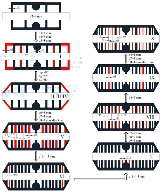 Geometric evolution of flow field designs (Models I–X) highlighting structural modifications for dead-zone compensation (black regions represent the original channels; red regions indicate newly introduced or modified channels across models. Arrows indicate the direction of design iteration).
