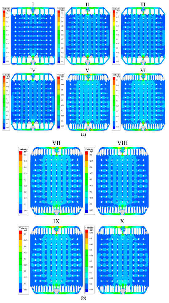 Velocity contours with velocity distributions above 0.055 m/s for different fluid channel types: (a) channel structures I–VI; (b) channel structures VII–X.