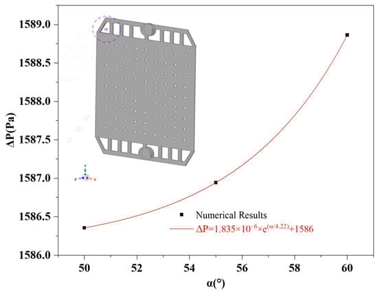 The correlation between the pressure drop (ΔP) and the channel deflection angle (α).