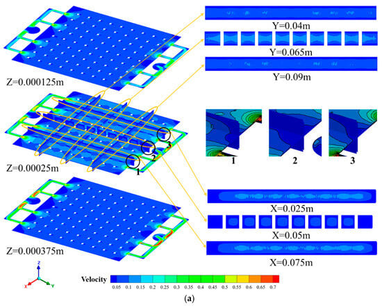 Figure 7a presents the velocity distribution of the reference channel structure (Ref) for a more thorough investigation of the flow fields of the Ref and IX channels (the location of each section is detailed in Supplementary Materials Figures S6 and S7). A large-area flow dead zone was generated on both sides of the inlet and outlet secondary branch channels and in the thickness direction for Z = 0.000125 m, 0.00025 m, and 0.000375 m. This observation was consistent with the results of the analysis in Section 3.1. For the planes at Y = 0.04 m, 0.065 m, and 0.09 m, it was not difficult to see that the near-wall fluid velocity remained at a lower level. This was due to the viscous force of the fluid itself, which caused the fluid near the wall to adhere to the solid in avoiding stagnation, and the velocity was almost 0. Further, the static fluid layer experienced friction towards its adjacent flowing fluid layer, causing the velocity of the adjacent fluid to slow down. This effect was transmitted to the entire fluid domain, thus forming the velocity distribution that is presented in Figure 7a. This velocity distribution was also reflected in the planes at X = 0.025 m, 0.05 m, and 0.075 m, so it was no longer repeated. At the intersections of the three X planes with the Z = 0.00025 m plane, the velocity contours of the three flow fields were clearly enlarged. There was almost no velocity gradient in the low-speed region, which was not favorable for the improvement of the speed in this region. Moreover, Figure 7b presents the velocity distribution in the IX channel structure. Compared with the Reference channel structure, the fluid flow velocity was faster and the distribution characteristics were better on the Z-axis sliced plane. In particular, the proportion of the flow dead-zone area was significantly reduced to almost 0. For the low-speed zone, there was an obvious velocity gradient in the velocity contour at the intersection of the X plane with the Z = 0.00025 m plane. This indicated that the fluid flow rate could be further improved, which was important for the elimination of the flow dead-zone area in the reaction zone.